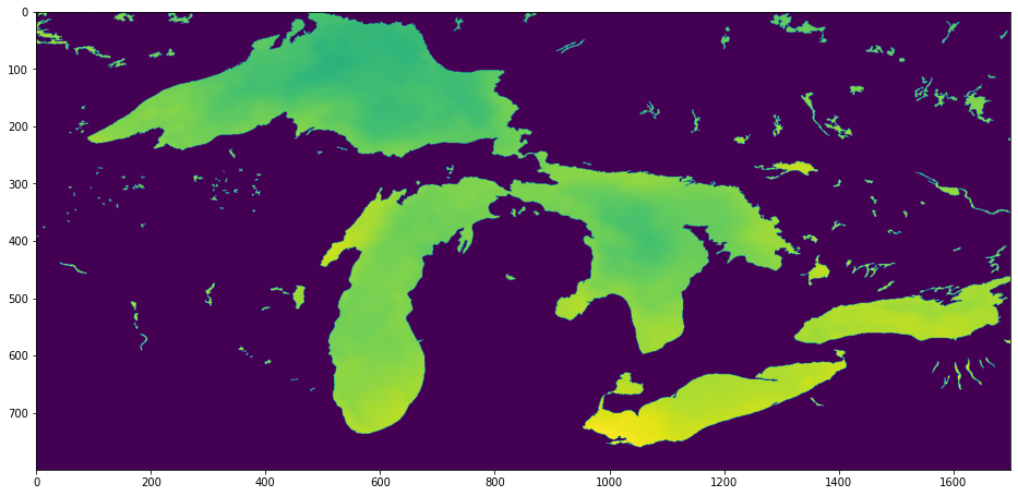 Fetch the latitude and longitude arrays and determine start and end indices for our area of interest. In this case, we’re looking at the Great Lakes, which have a nice, recognizeable shape. Latitudes 41 to 49, longitudes -93 to 76.