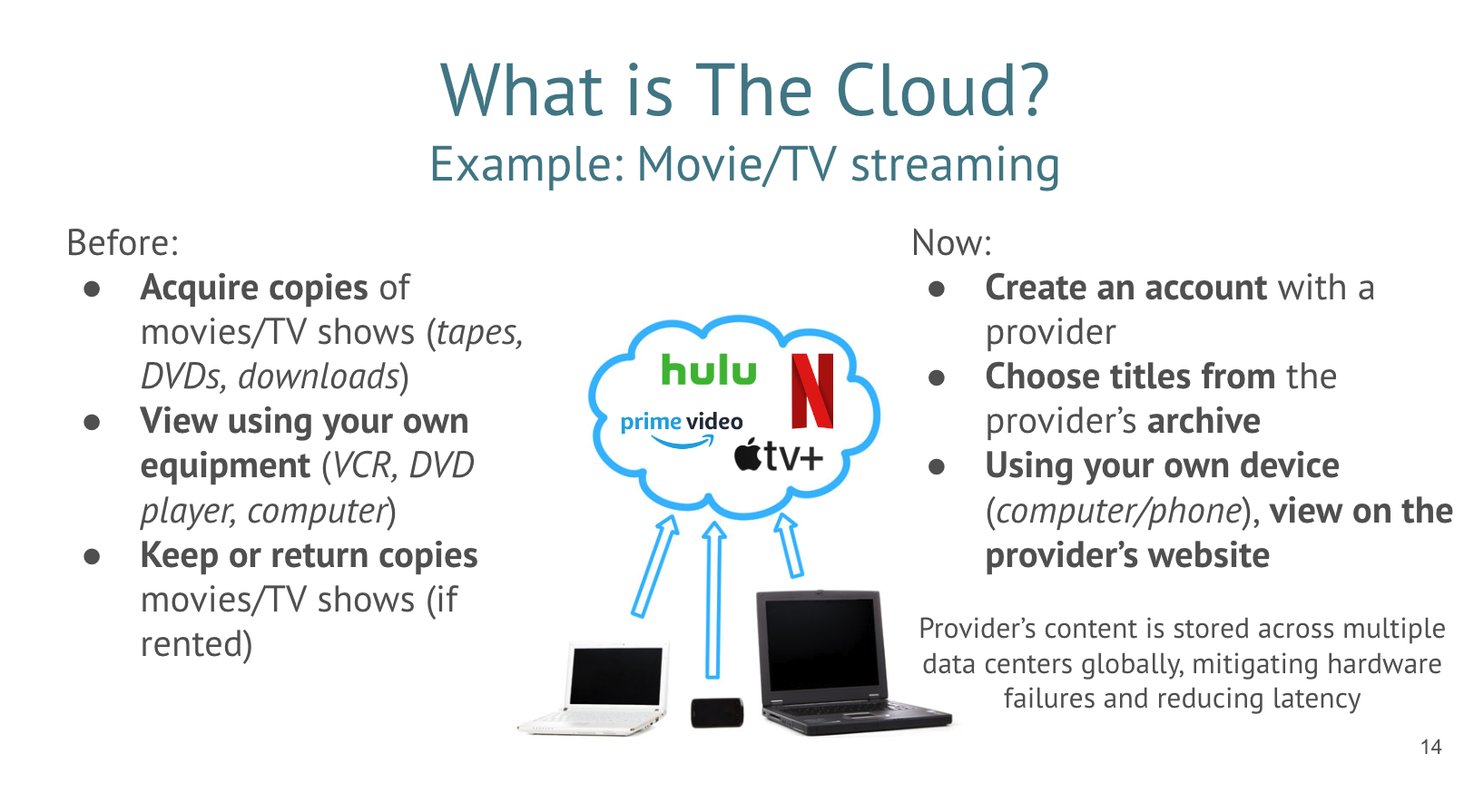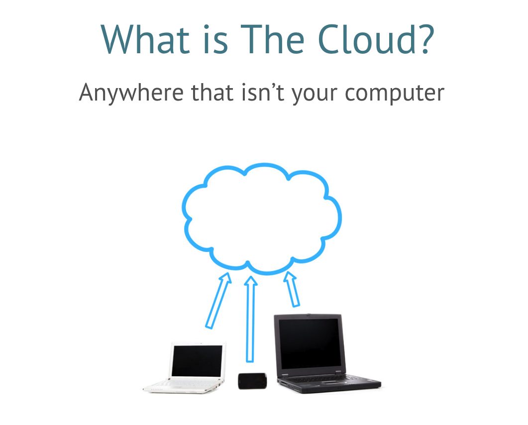 At a basic level, “The Cloud” is somewhere that isn’t your computer. We all interact with data and services and that live in “The Cloud” in our daily lives. When we store photos in iCloud or Google accounts instead of on our cell phones, we are using cloud storage. When we watch movies and tv shows on streaming services like Netflix or Hulu, we are using the cloud. In these cases, we are interacting with “the cloud” without knowing it, though we, the user, are not in “the cloud”.