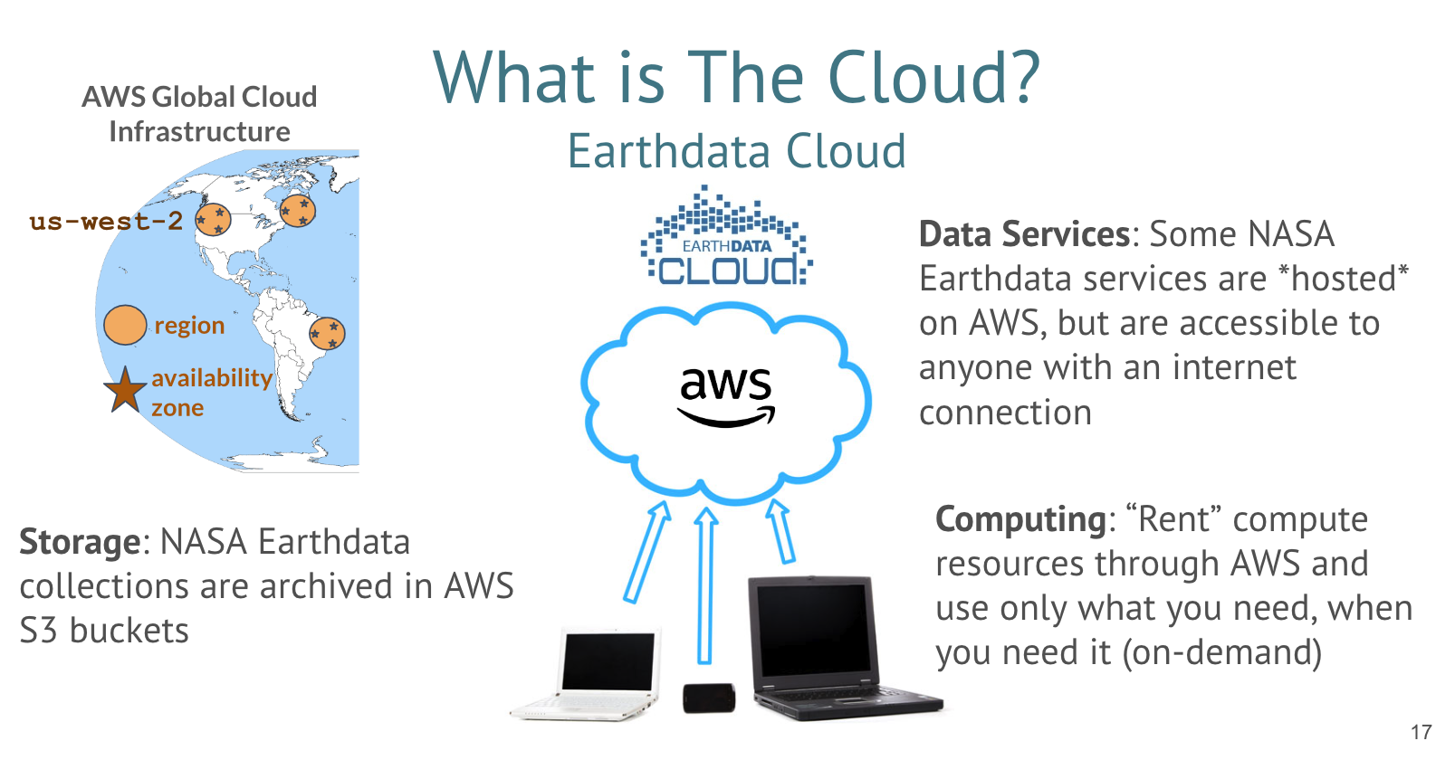 The following guidance is specific to NASA Earthdata and the particular cloud it is stored in, Amazon Web Services (AWS). While some services provided by NASA data archives are cloud-based and you interact with, the guidance below refers to using compute and storage services provided by AWS that allow a user to work closely, or in the same cloud, as the data.