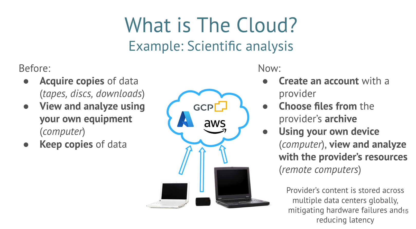 If you use services like computing and storage, provided by a cloud service provider (Amazon Web Services, Microsoft Azure, Google Cloud Platform, etc.), then you are in “the cloud”. Remember, “the cloud” is somewhere that isn’t your computer. The storage location is elsewhere and the machines and processing is elsewhere.